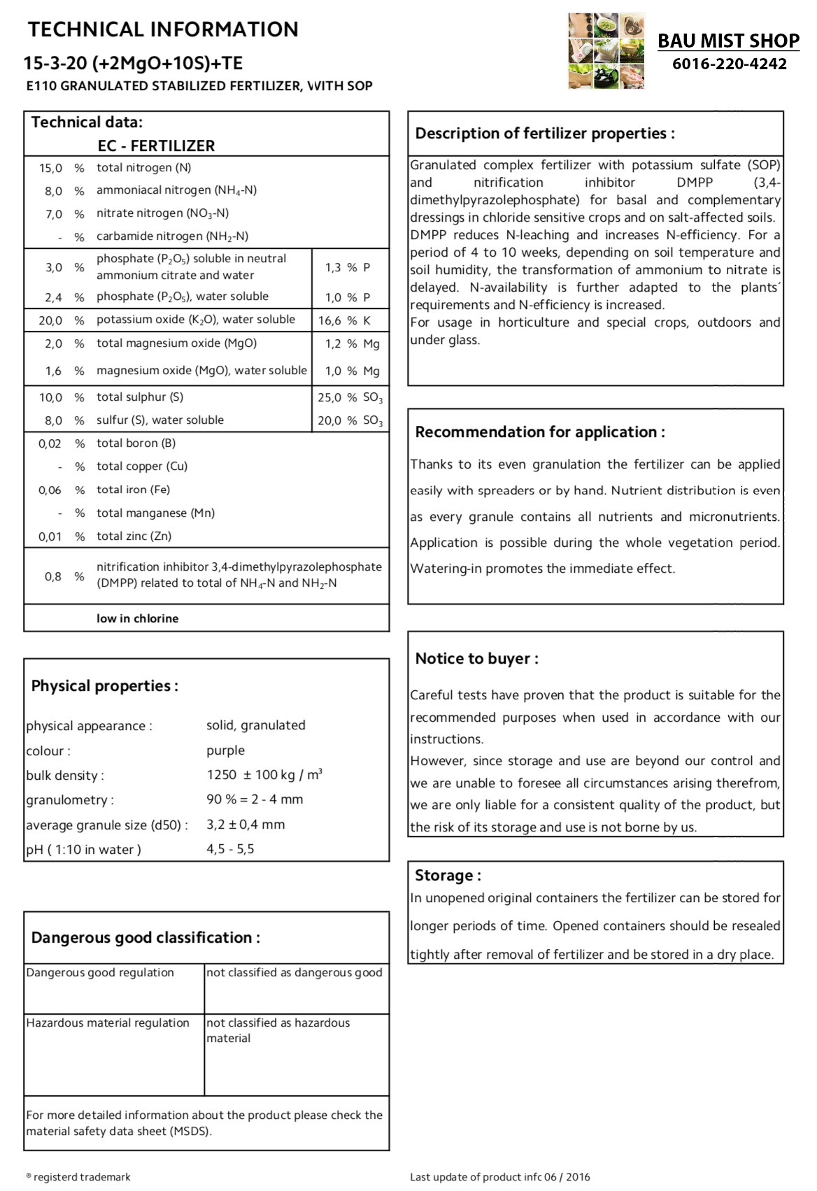 This is a NPK complex fertilizer with nitrification inhibitor DMPP (3, 4-dimethylpyrazolphosphate). It reduces N-leaching and increases N-efficiency. During the active phase of DMPP (4 to 10 weeks, depending on soil temperatureans soil humidity) the transformation of ammonium to nitrate is delayed. As a result N-availability is futher adapted to the plant' requirements and N-efficiency is increased.